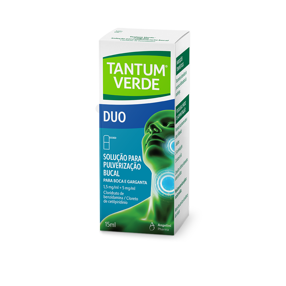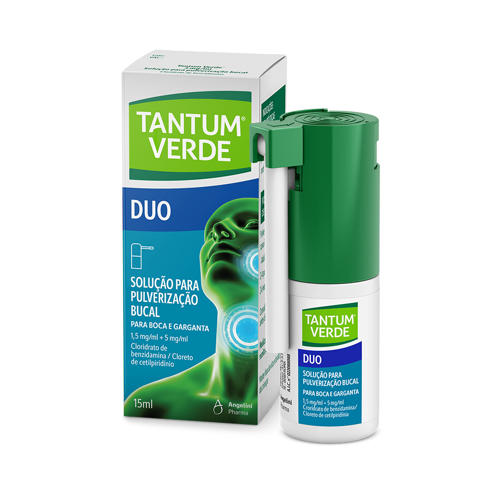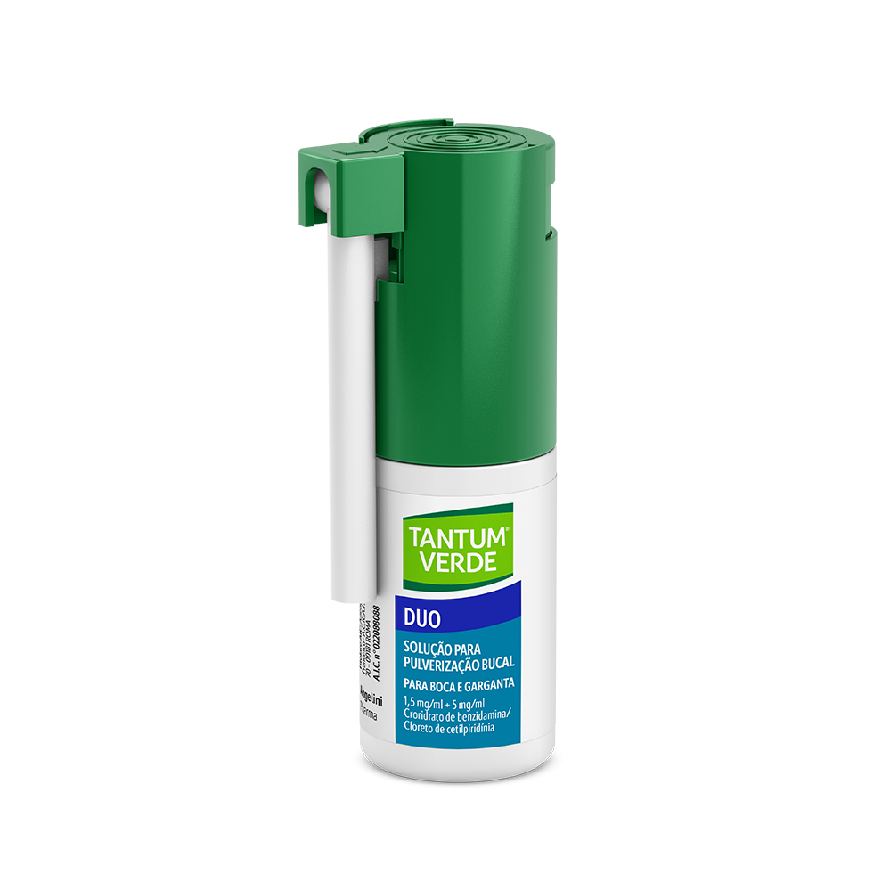 Aos primeiros sintomas de dor de garganta, utilize Tantum Verde Spray Duo. Graças à ação anti-inflamatória da Benzidamina e à ação anti-viral do Cloreto de cetilpiridínio, combate a progressão da infeção/dor de garganta. Para adultos e crianças a partir dos 6 anos de idade.